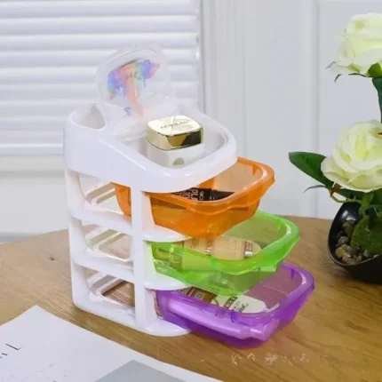This is a 3-layer multipurpose plastic drawer organizer — perfect for keeping your small items neat and tidy. It comes with three colorful drawers (orange, green, and purple) and a white frame that gives it a modern look.