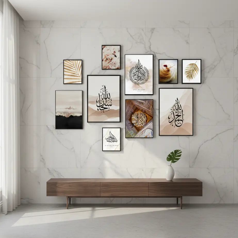 The Islamic Calligraphy Photo Tiles Set includes 10 beautifully designed frames, perfect for enhancing your home décor. Each tile comes with strong double tape at the back for easy wall mounting without nails or tools